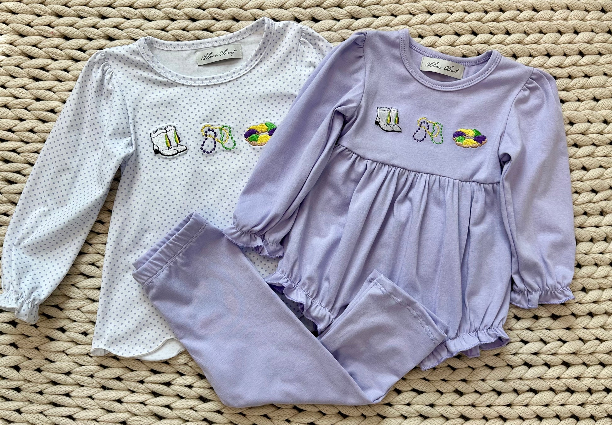Embroidered boots, beads, and king cake. Knit material. Top and legging set.