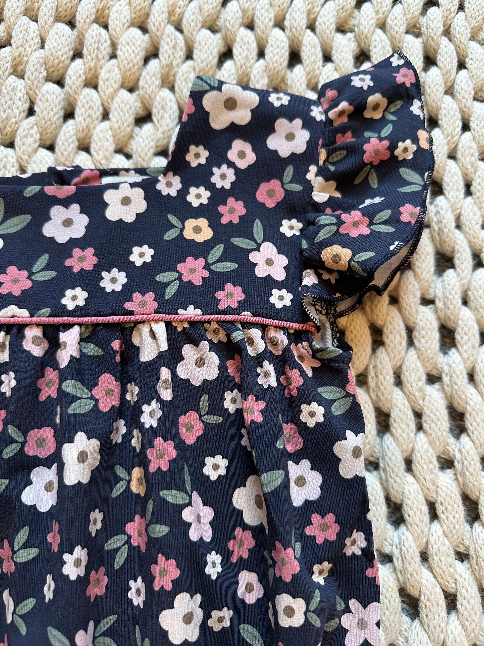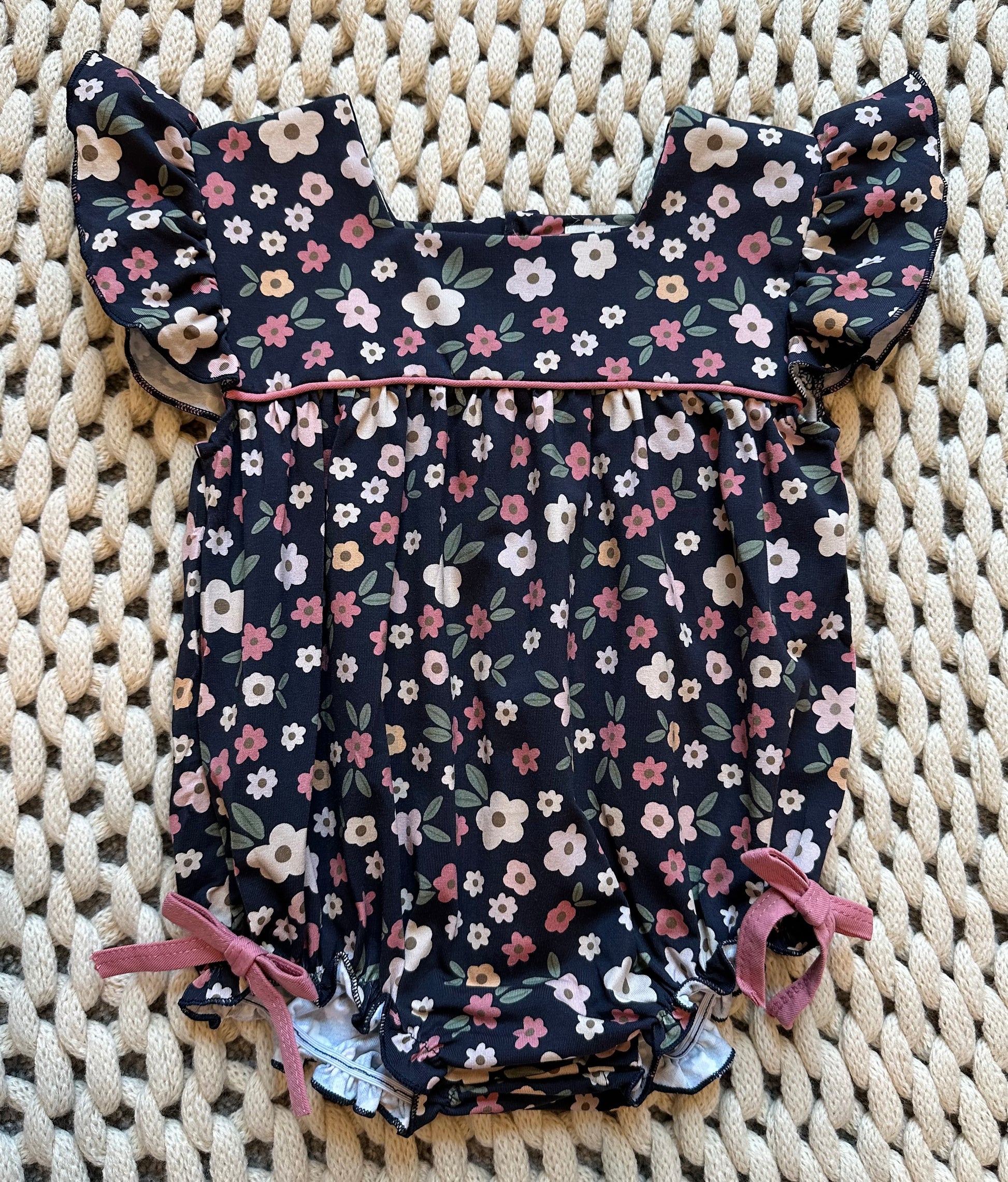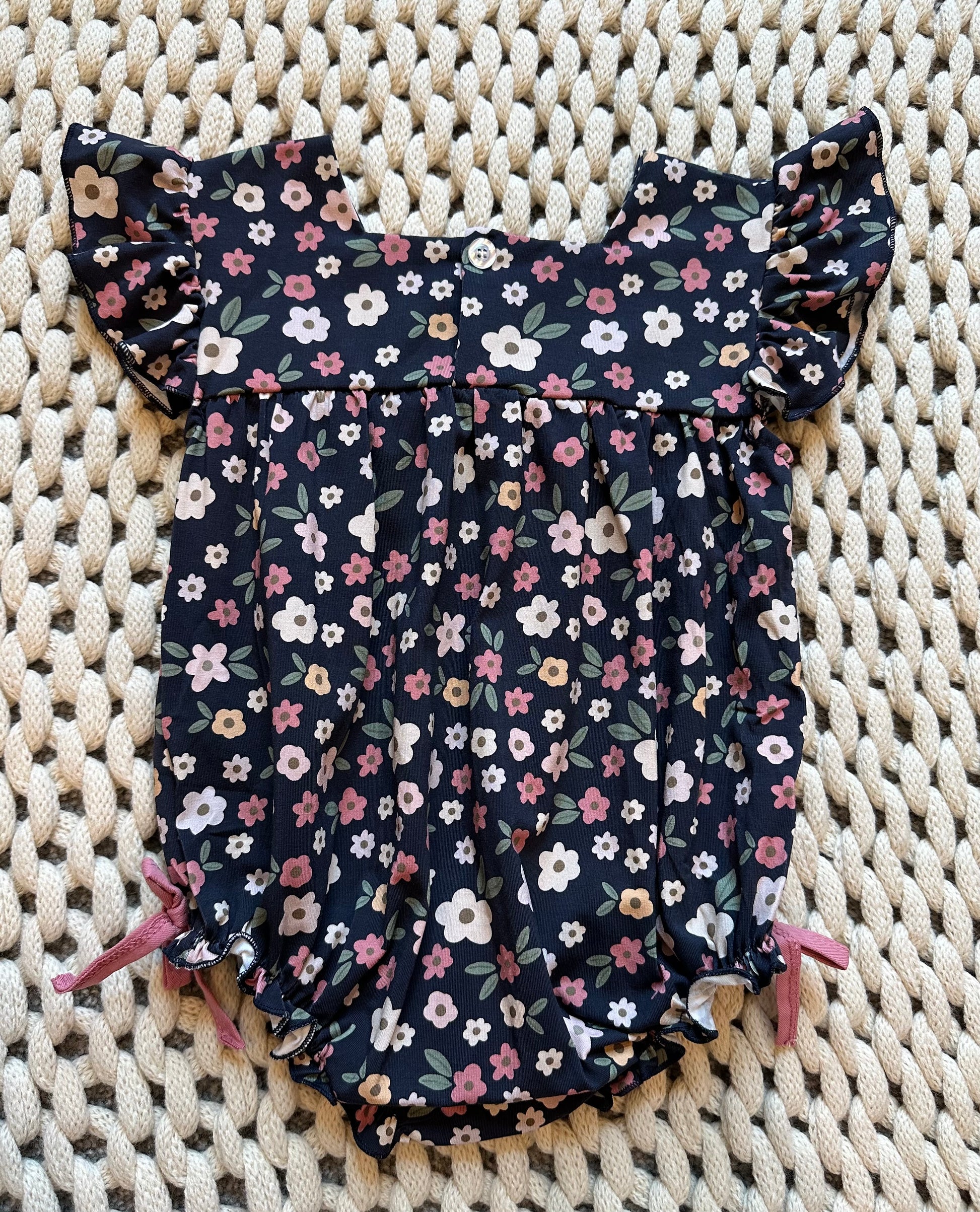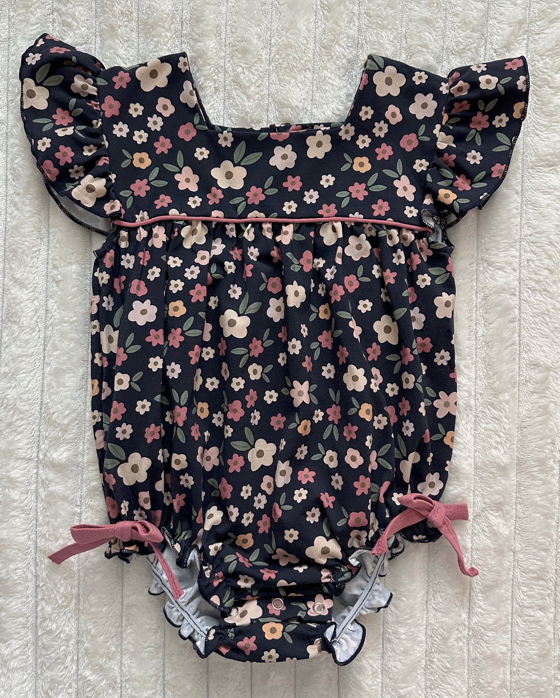 Get ready for the “ber” months with this adorable floral bubble. This bubble has flutter sleeves, snap closure buttons, and sewed-in ties on the bottom for that extra pop.