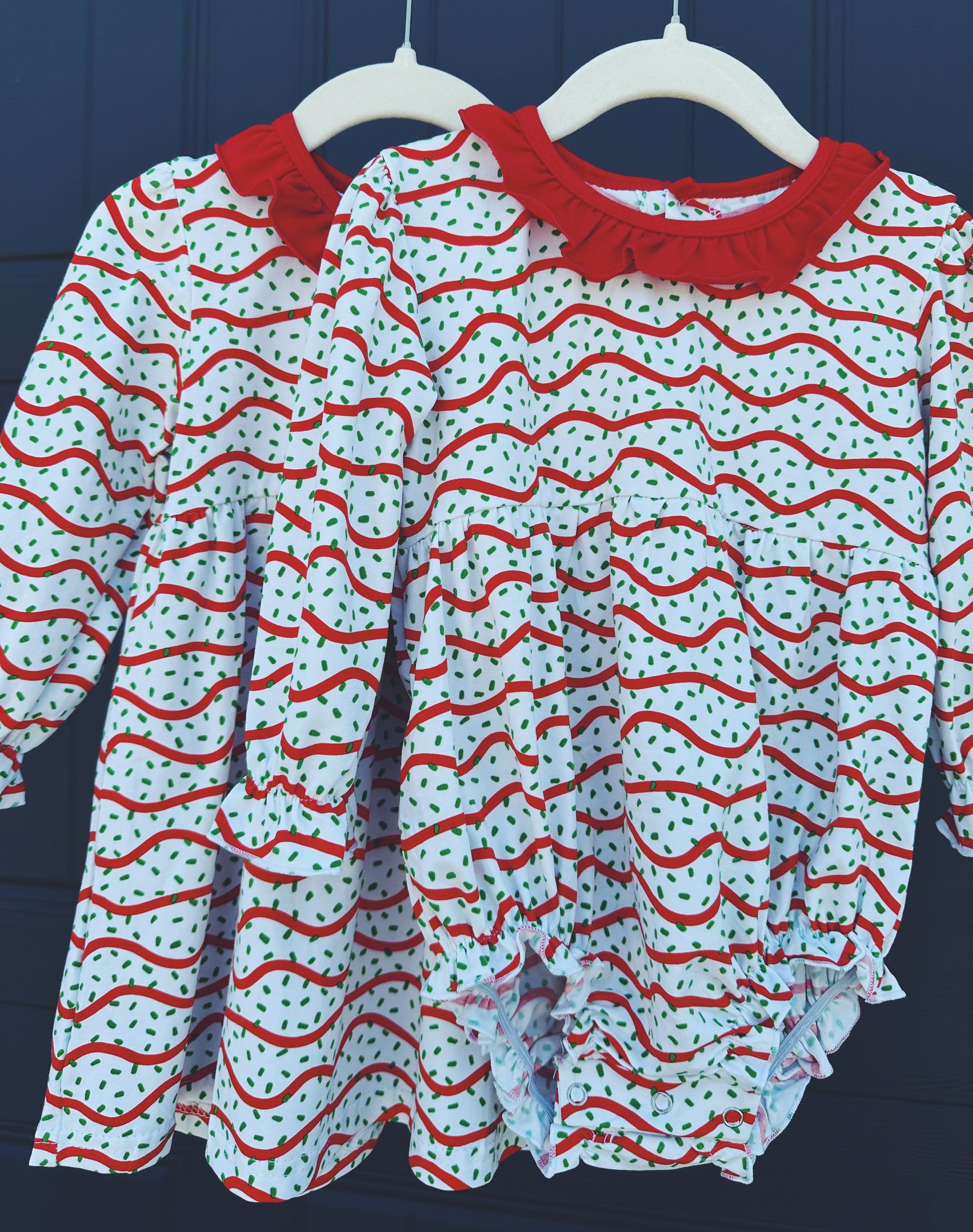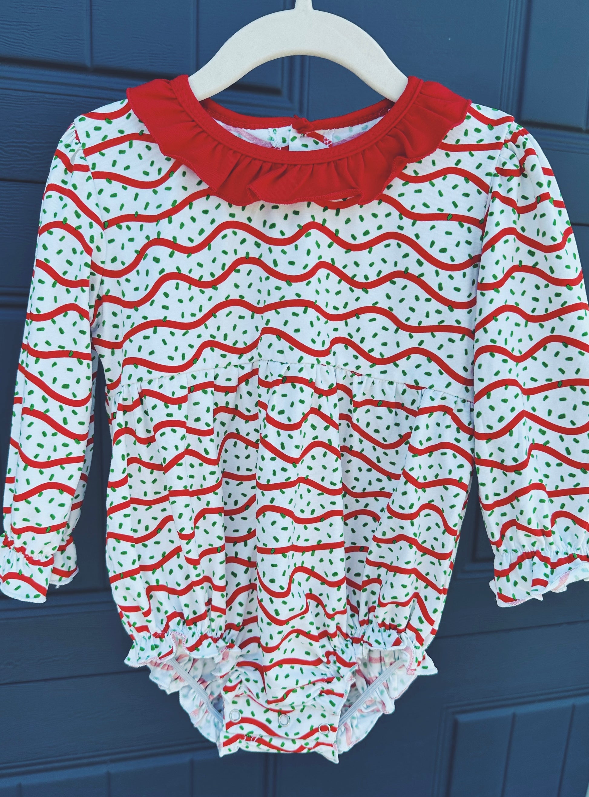 Inspired by our favorite Christmas tree cake snack 👀 These Debra bubbles are sure to be a hit during the holiday season. These run TTS with stretch so if in-between sizes, stick with lower size. Three button closure in back.