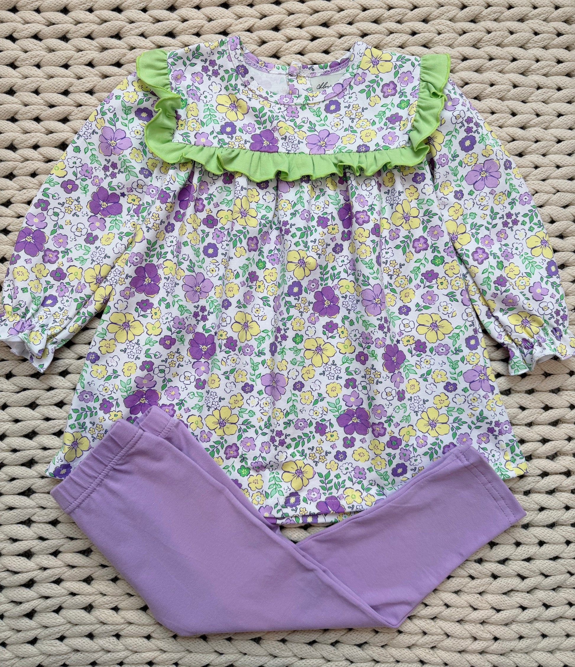 The cutest floral set to celebrate the Carnival season. The shirt is flowy and oversized while the leggings are TTS. Ruffle trim in the front with no ruffle on the back. Two button closure. This outfit is a Mardi staple that can be worn throughout spring!